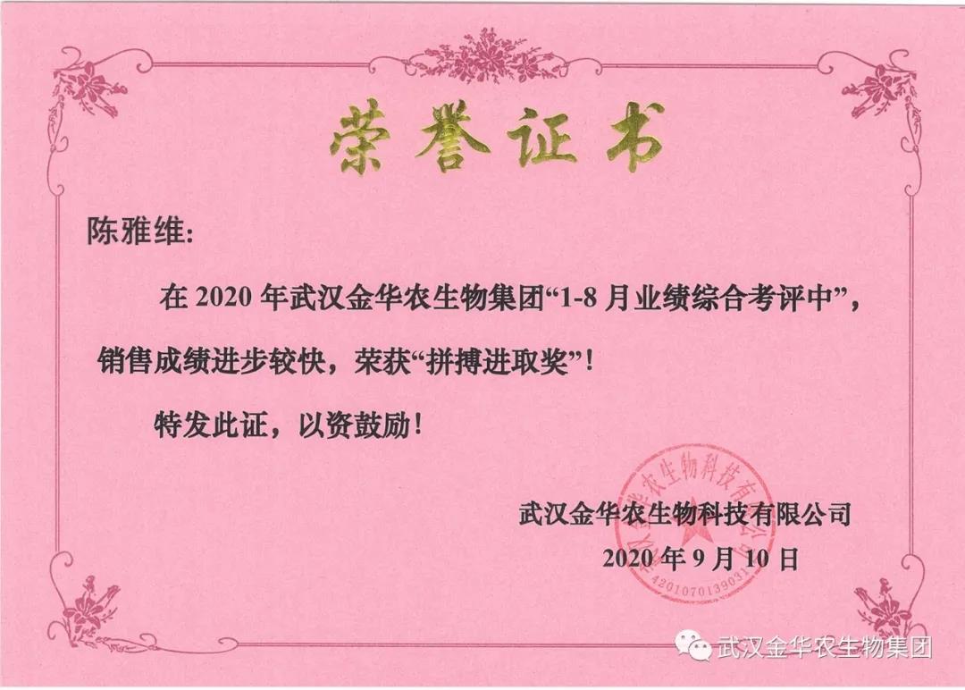 祝賀遼寧陳雅維經(jīng)理,他在2020年武漢金華農(nóng)生物集團(tuán)“1-8月業(yè)績綜合考評中”銷售成績進(jìn)步較快,他拼搏進(jìn)取,踴躍報(bào)貨,榮獲武漢金華農(nóng)新人團(tuán)隊(duì)“拼搏進(jìn)取獎”,他是一位優(yōu)秀的“新晉武漢金華農(nóng)人”,為他鼓掌!為他點(diǎn)贊!