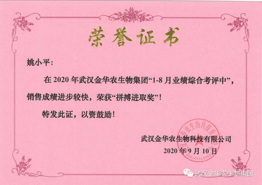祝賀寧夏姚小平經(jīng)理,他在2020年武漢金華農(nóng)生物集團(tuán)“1-8月業(yè)績綜合考評中”銷售成績進(jìn)步較快,他拼搏進(jìn)取,踴躍報(bào)貨,榮獲武漢金華農(nóng)新人團(tuán)隊(duì)“拼搏進(jìn)取獎”,他是一位優(yōu)秀的“新晉武漢金華農(nóng)人”,為他鼓掌!為他點(diǎn)贊!