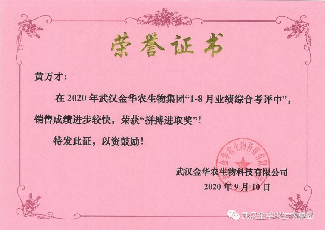 祝賀安徽黃萬才經(jīng)理,他在2020年武漢金華農(nóng)生物集團(tuán)“1-8月業(yè)績綜合考評中”銷售成績進(jìn)步較快,他拼搏進(jìn)取,踴躍報(bào)貨,9獲武漢金華農(nóng)新人團(tuán)隊(duì)“拼搏進(jìn)取獎”,他是一位優(yōu)秀的“新晉武漢金華農(nóng)人”,為他鼓掌!為他點(diǎn)贊!