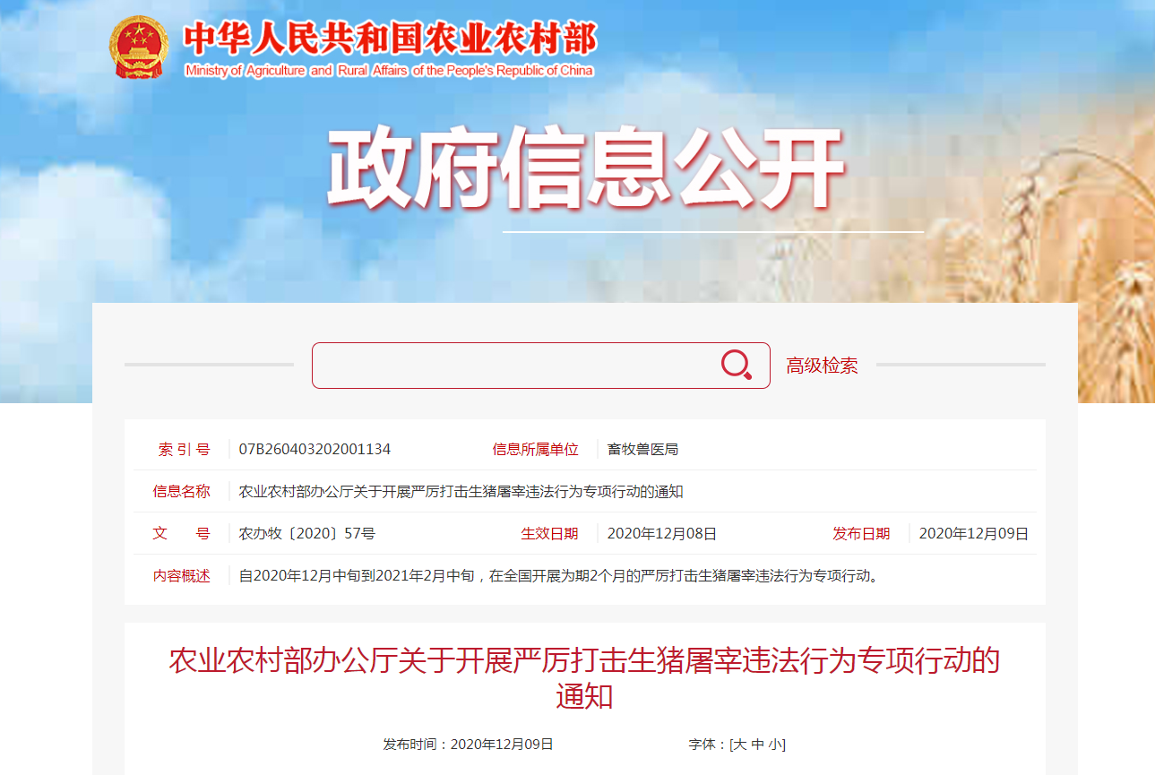 今年以來,各地通過開展農(nóng)產(chǎn)品質(zhì)量安全專項(xiàng)整治“利劍”行動(dòng),查辦了一批屠宰環(huán)節(jié)違法案件、搗毀了一批私屠濫宰窩點(diǎn)、銷毀了一批問題產(chǎn)品,有力支持了全國非洲豬瘟防控和生豬生產(chǎn)恢復(fù),有效保障了生豬產(chǎn)品質(zhì)量安全。隨著冬季,特別是元旦春節(jié)消費(fèi)旺季的到來,豬肉產(chǎn)品消費(fèi)將進(jìn)入高峰期,從近期各地案件查辦情況看,私屠濫宰等屠宰環(huán)節(jié)違法案件呈上升趨勢。為切實(shí)維護(hù)生豬屠宰行業(yè)秩序,保證生豬產(chǎn)品質(zhì)量安全,保障節(jié)日期間豬肉消費(fèi)安全和人民身體健康,農(nóng)業(yè)農(nóng)村部決定自2020年12月中旬到2021年2月中旬,在全國開展為期2個(gè)月的嚴(yán)厲打擊生豬屠宰違法行為專項(xiàng)行動(dòng)?,F(xiàn)就有關(guān)事項(xiàng)通知如下。