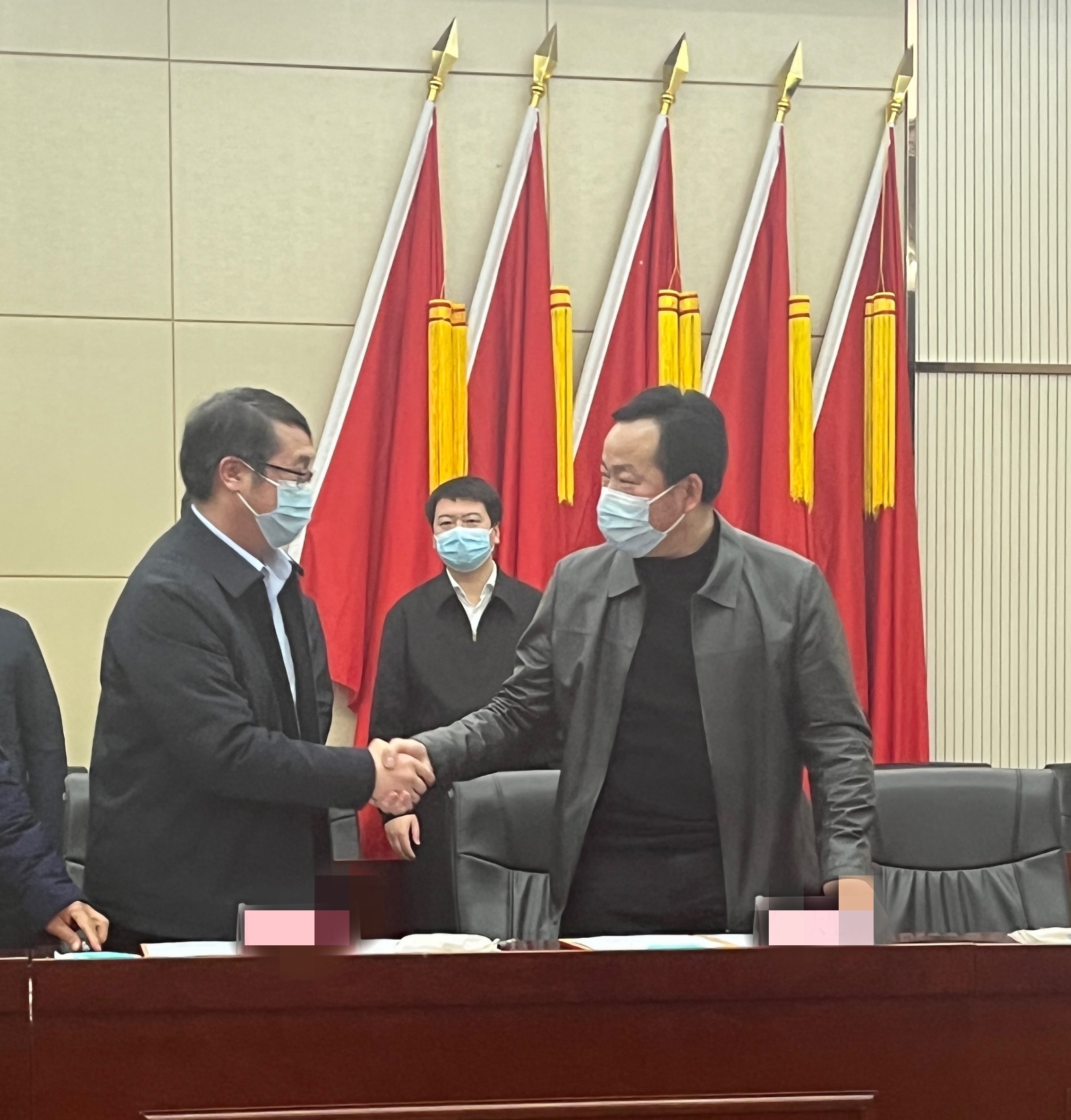 ▲公司董事長、總經(jīng)理富勝與市領(lǐng)導(dǎo)親切友好握手