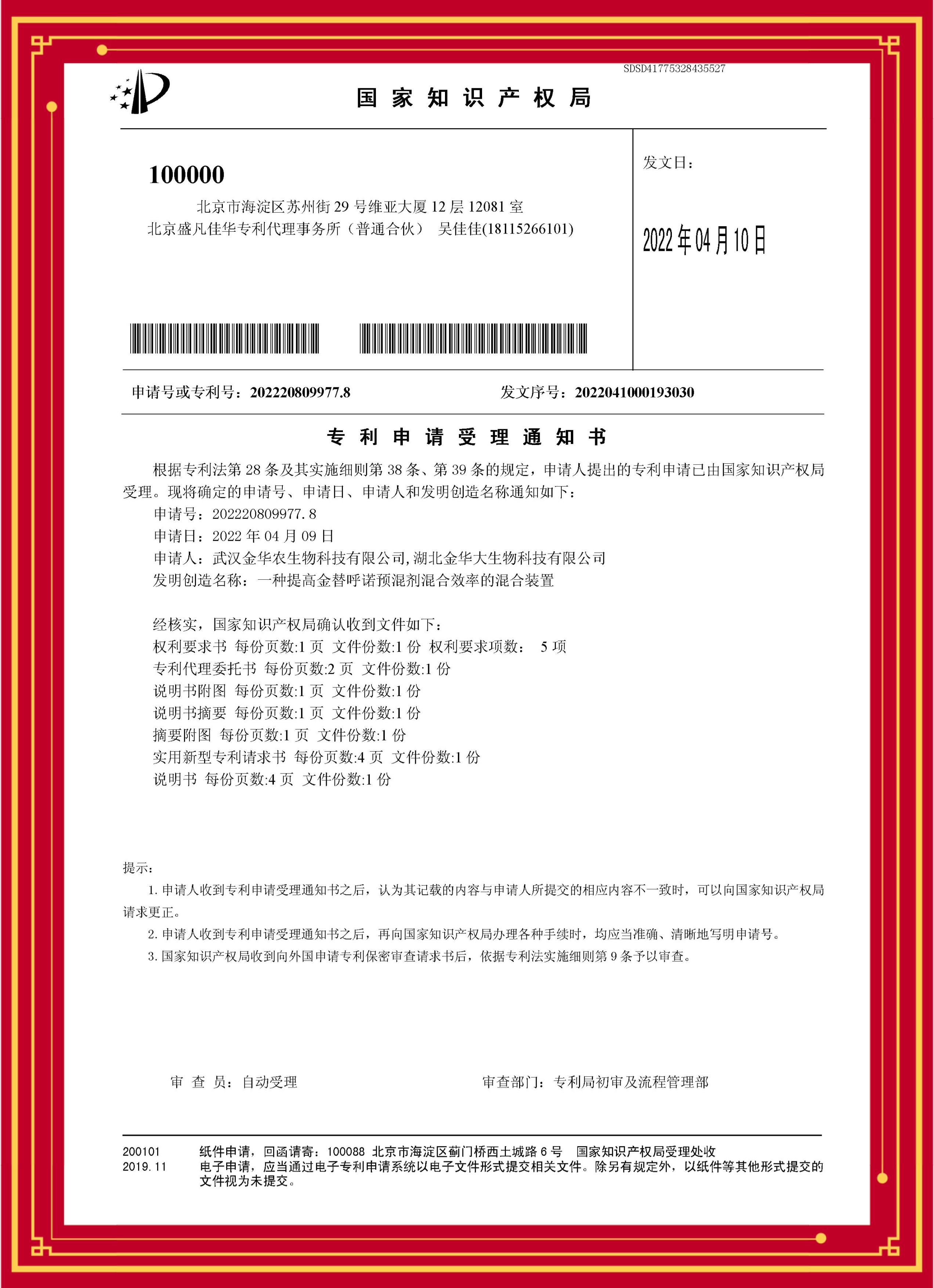 ? ? 繼首批“優(yōu)樂肽、快速壯、氟泰肺寧”產(chǎn)品榮獲專利證書后,近日,武漢金華農(nóng)又一批拳頭產(chǎn)品獲得專利證書。產(chǎn)品“藍(lán)圓瘟毒克、金替呼諾、高熱病毒靈”科技發(fā)明專利,《一種能提高藍(lán)圓瘟毒克高熱病毒靈中藥提取率的提取裝置》,專利號:202220809144.1;《一種提高金替呼諾預(yù)混劑混合效率的混合裝置》,專利號:202220809977.8,獲得國家知識產(chǎn)權(quán)局授權(quán),并獲得專利受理證書。