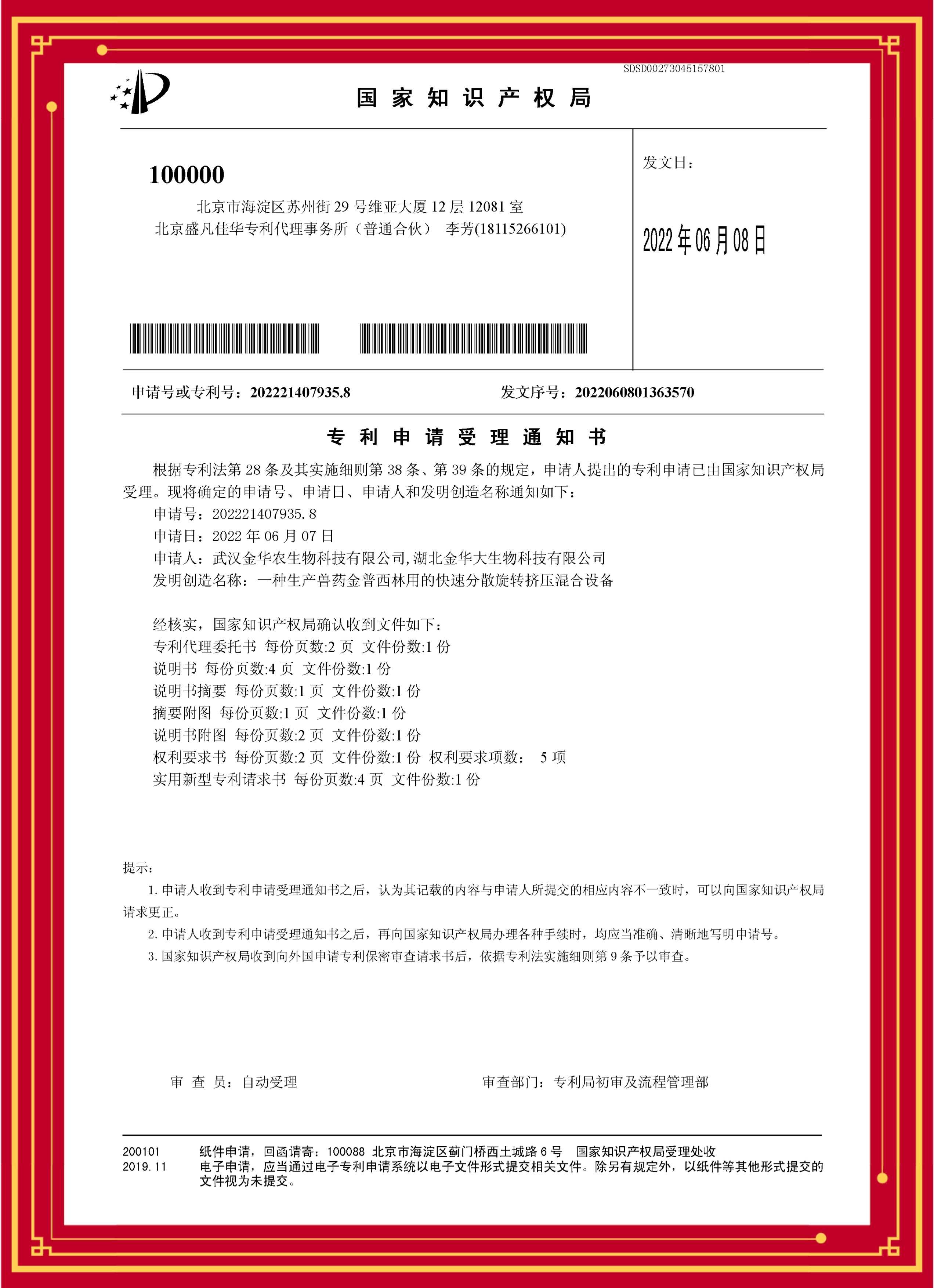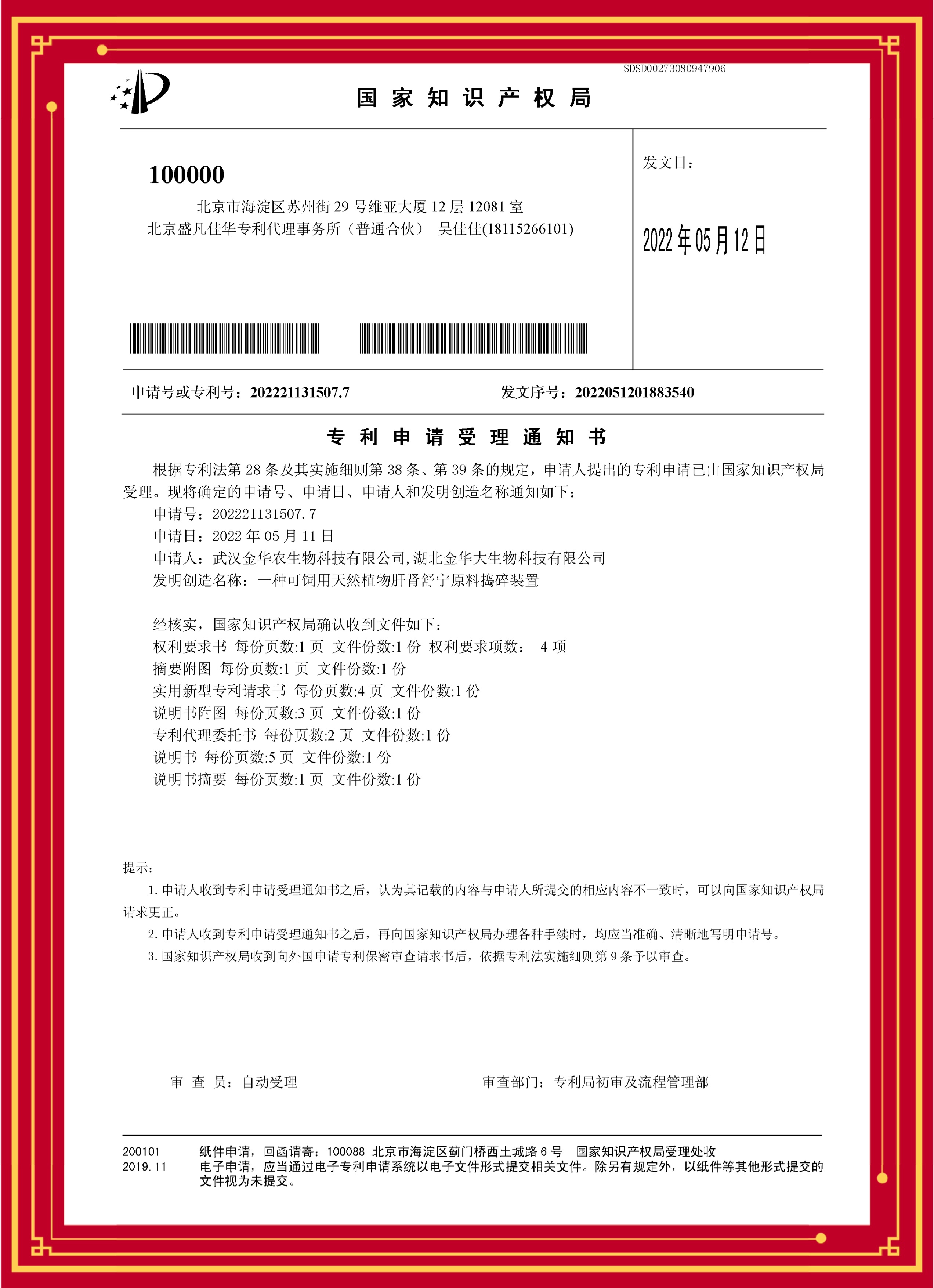 ? ? 繼“優(yōu)樂(lè)肽、快速壯、氟泰肺寧、藍(lán)圓瘟毒克、高熱病毒靈、金替呼諾”產(chǎn)品榮獲專利證書(shū)后,近日,武漢金華農(nóng)又一批拳頭產(chǎn)品獲得專利證書(shū)。產(chǎn)品“伊苯佳、黃金多維C、肝腎舒寧、弓球痢康、金普西林”5項(xiàng)目科技發(fā)明獲得國(guó)家榮譽(yù)專利,《一種家禽養(yǎng)殖用殺蟲(chóng)劑伊苯佳配制長(zhǎng)效裝置》,專利號(hào):202221076567.3;《一種用于飼料添加劑黃金多維C的輔料原料粉碎增效機(jī)構(gòu)》,專利號(hào):202221071292.4;《一種可飼用天然植物龍膽護(hù)肝素肝腎舒寧原料搗碎裝置》,專利號(hào):202221131507.7;《一種獸藥生產(chǎn)用弓球痢康粉劑包裝機(jī)》,專利號(hào):202221108553.5;《一種生產(chǎn)獸藥金普西林用的快速分散旋轉(zhuǎn)擠壓混合設(shè)備》,專利號(hào):202221407935.8,獲得國(guó)家知識(shí)產(chǎn)權(quán)局授權(quán),并獲得專利受理證書(shū)。