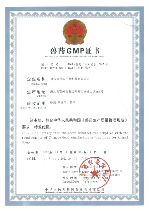 武漢金華農(nóng)獸藥GMP證書號(hào):(2022)獸藥GMP證字17038號(hào)