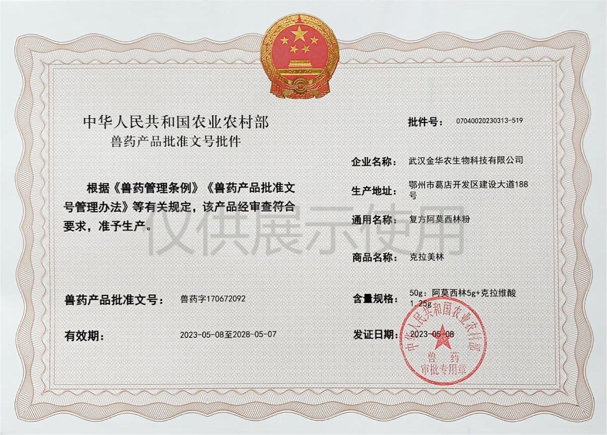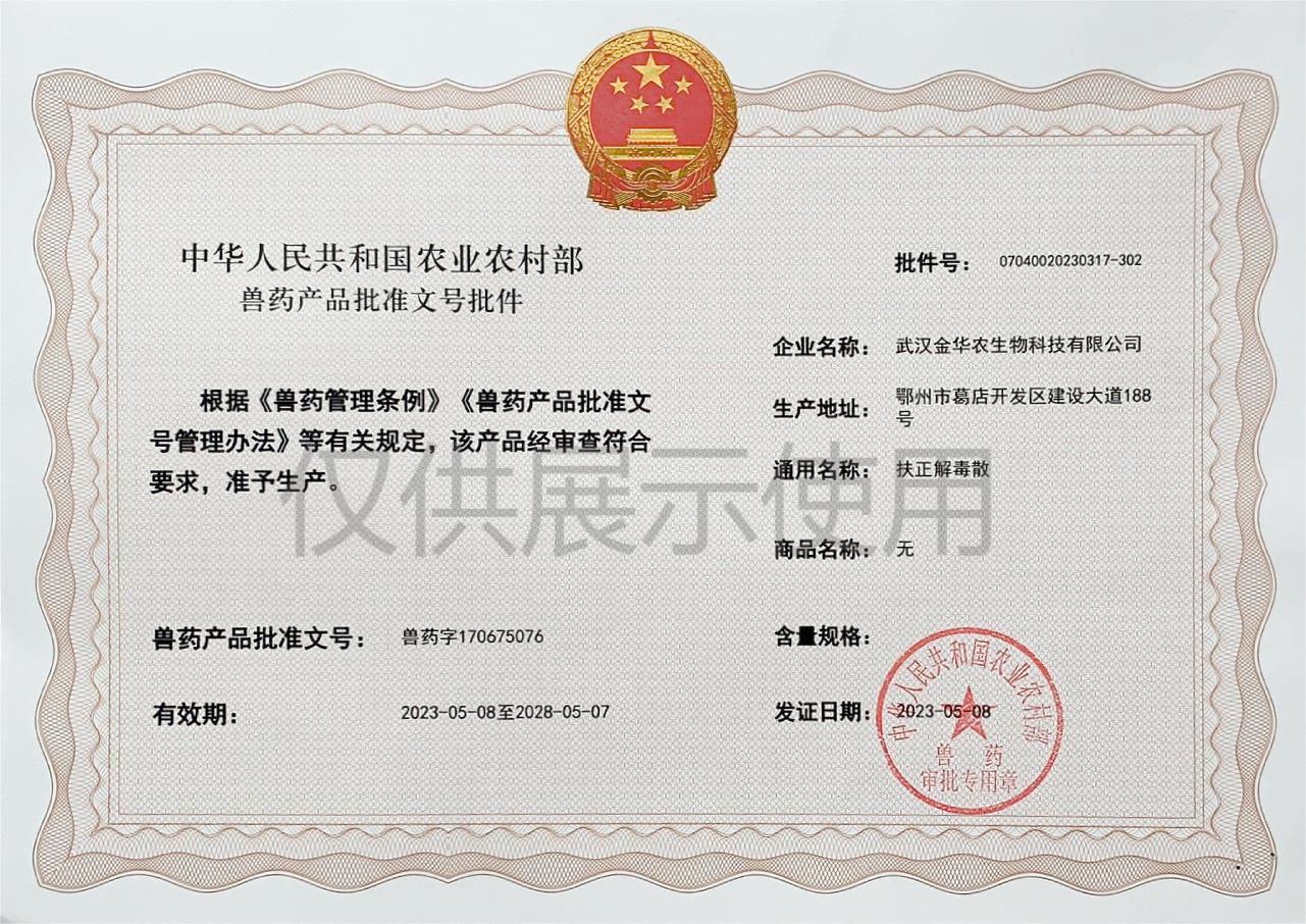 根據《獸藥管理條例》和《獸藥產品批準文號管理辦法》的規(guī)定,經國家農業(yè)農村部審查,準予核發(fā)武漢金華農生物科技有限公司(以下簡稱“武漢金華農生物”)國家新版GMP獸藥相關產品批準文號。