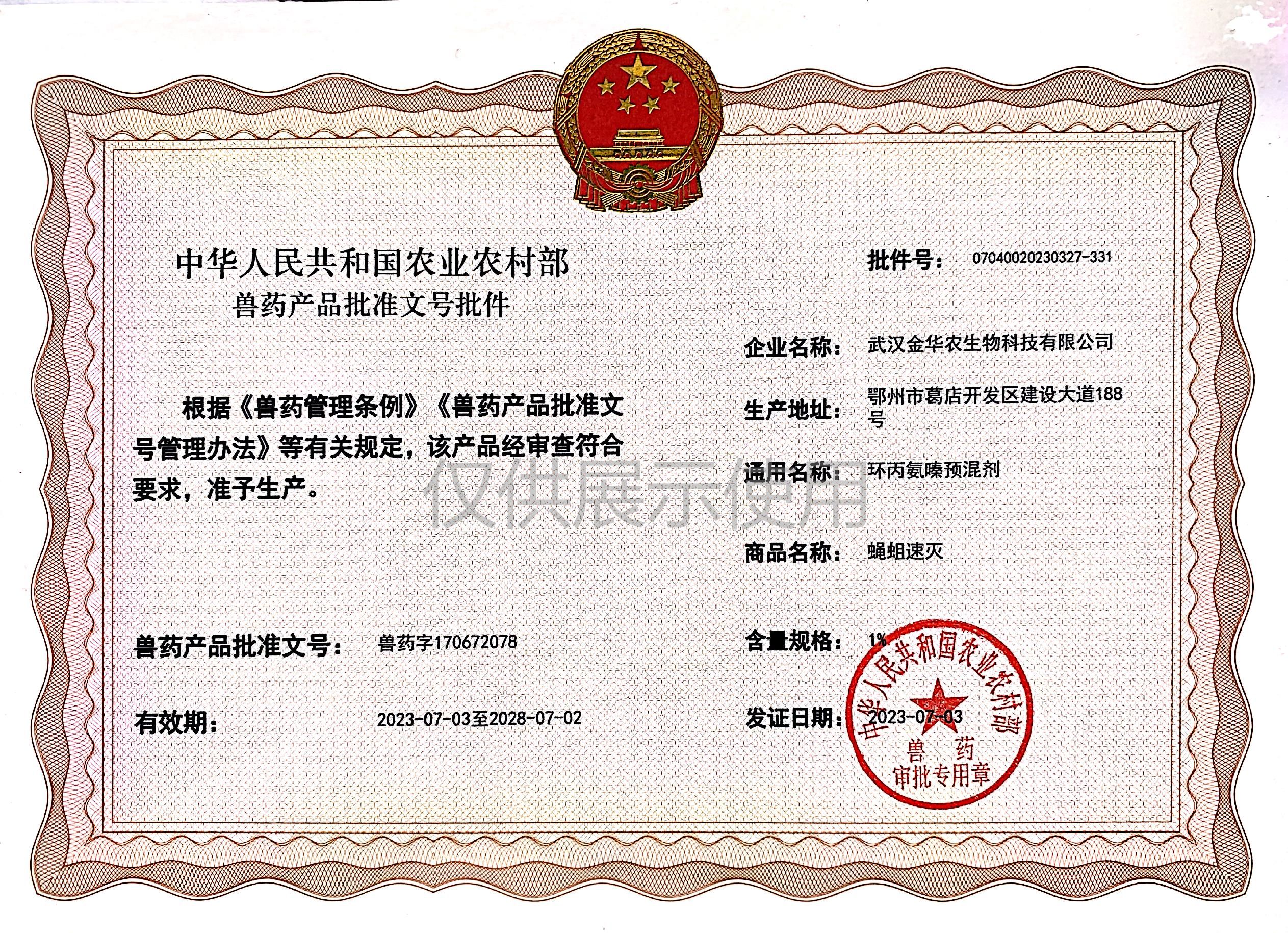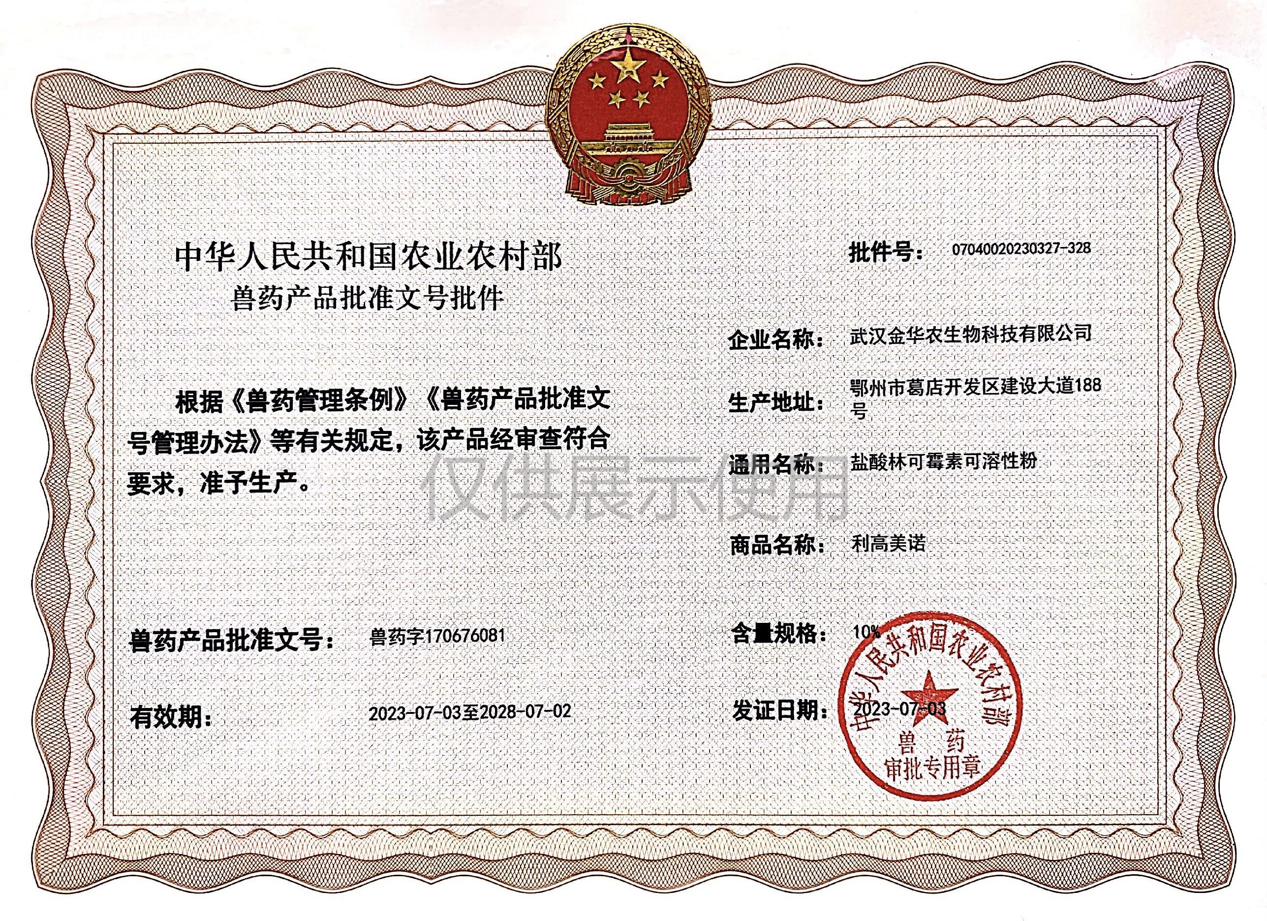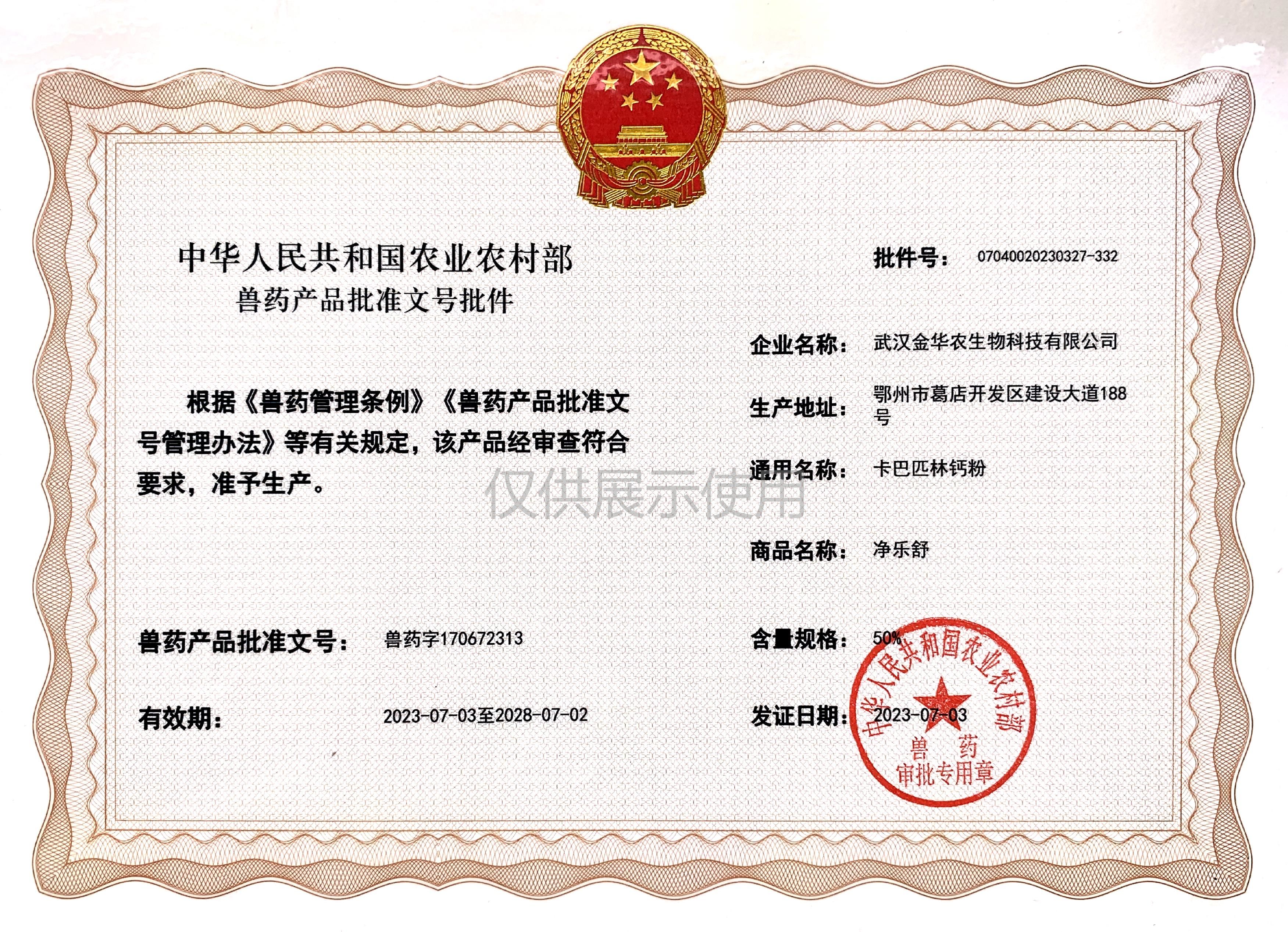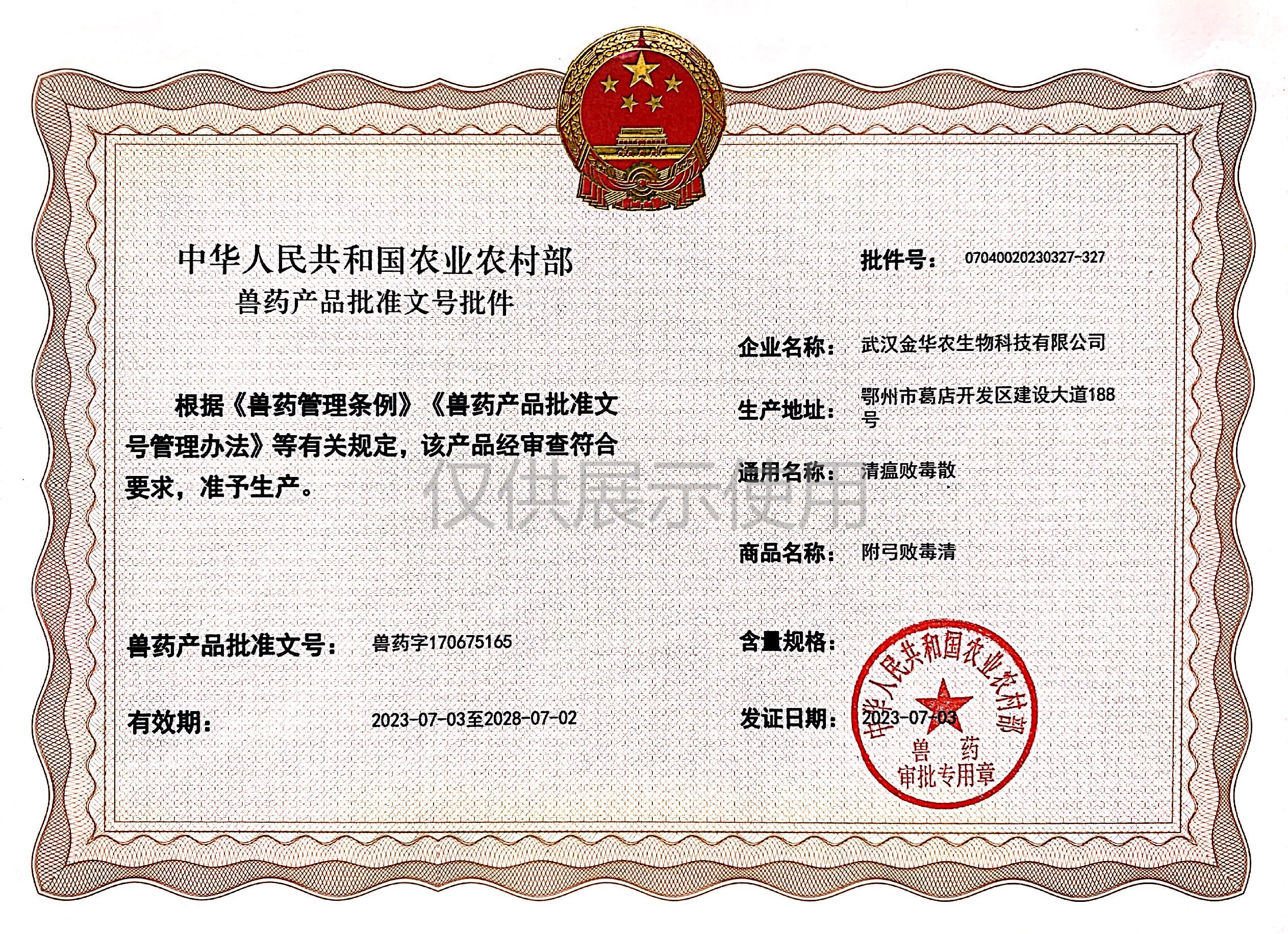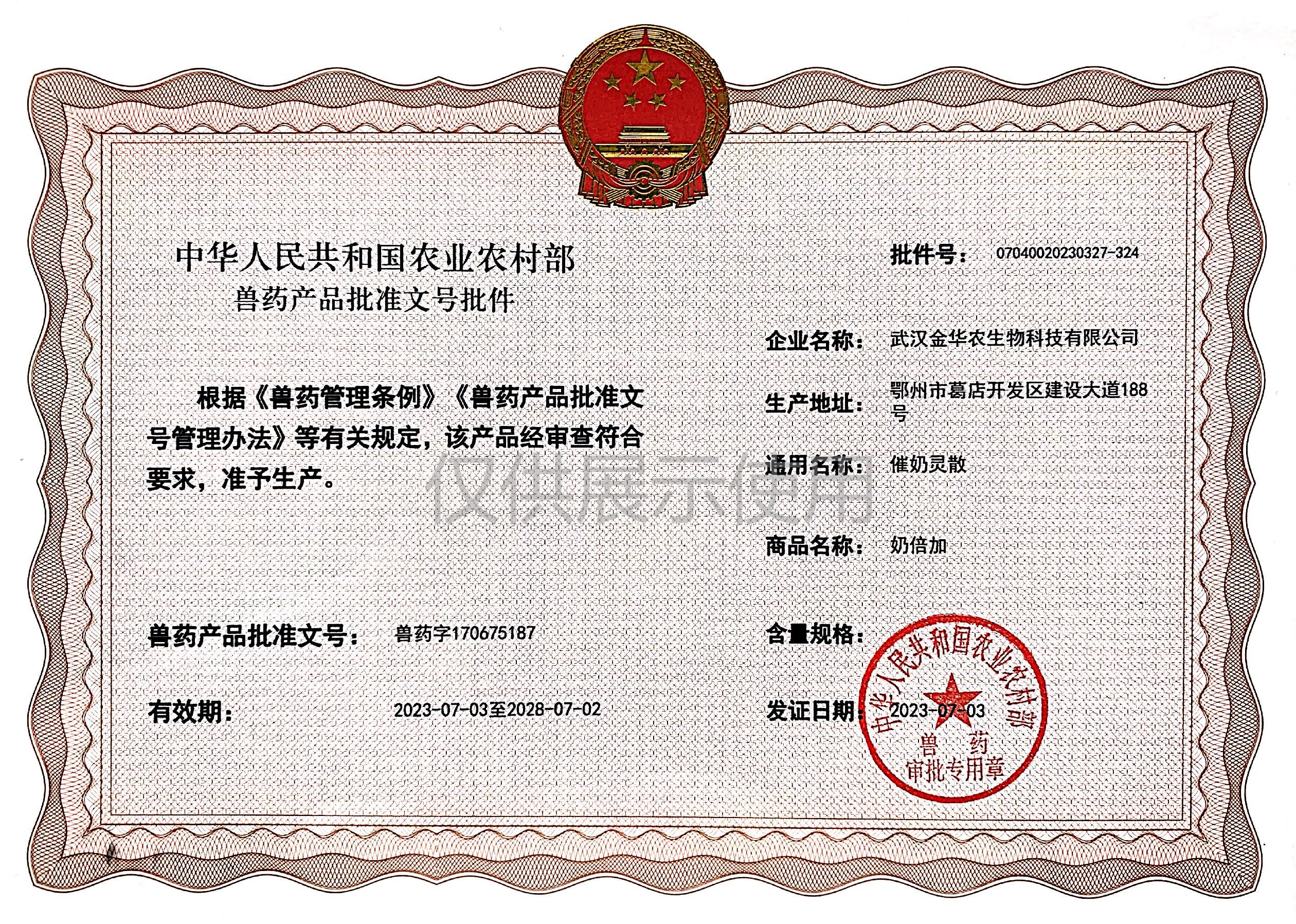 根據(jù)《獸藥管理?xiàng)l例》和《獸藥產(chǎn)品批準(zhǔn)文號(hào)管理辦法》的規(guī)定,經(jīng)農(nóng)業(yè)農(nóng)村部審查,準(zhǔn)予核發(fā)武漢金華農(nóng)生物科技有限公司(以下簡稱“武漢金華農(nóng)生物”)國家新版GMP9種獸藥相關(guān)產(chǎn)品批準(zhǔn)文號(hào),這是今年獲取的第三批獸藥產(chǎn)品批準(zhǔn)文號(hào),截至目前,我司已獲得農(nóng)業(yè)農(nóng)村部頒發(fā)的新版GMP獸藥文號(hào)20個(gè)。