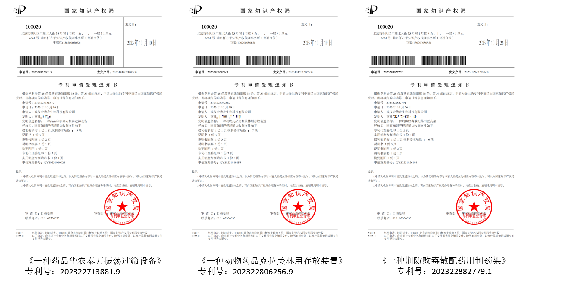 公司一共申報(bào)了9個(gè)科技發(fā)明專利。此次申報(bào)的專利產(chǎn)品深受養(yǎng)殖戶老板的喜愛,獸藥產(chǎn)品“球蟲立清、小柴胡散、華農(nóng)利可欣、華農(nóng)泰萬、克拉美林、荊防敗毒散、華農(nóng)超諾、地美金典、附優(yōu)金樂”等口碑良好,贏得市場一致好評(píng)。