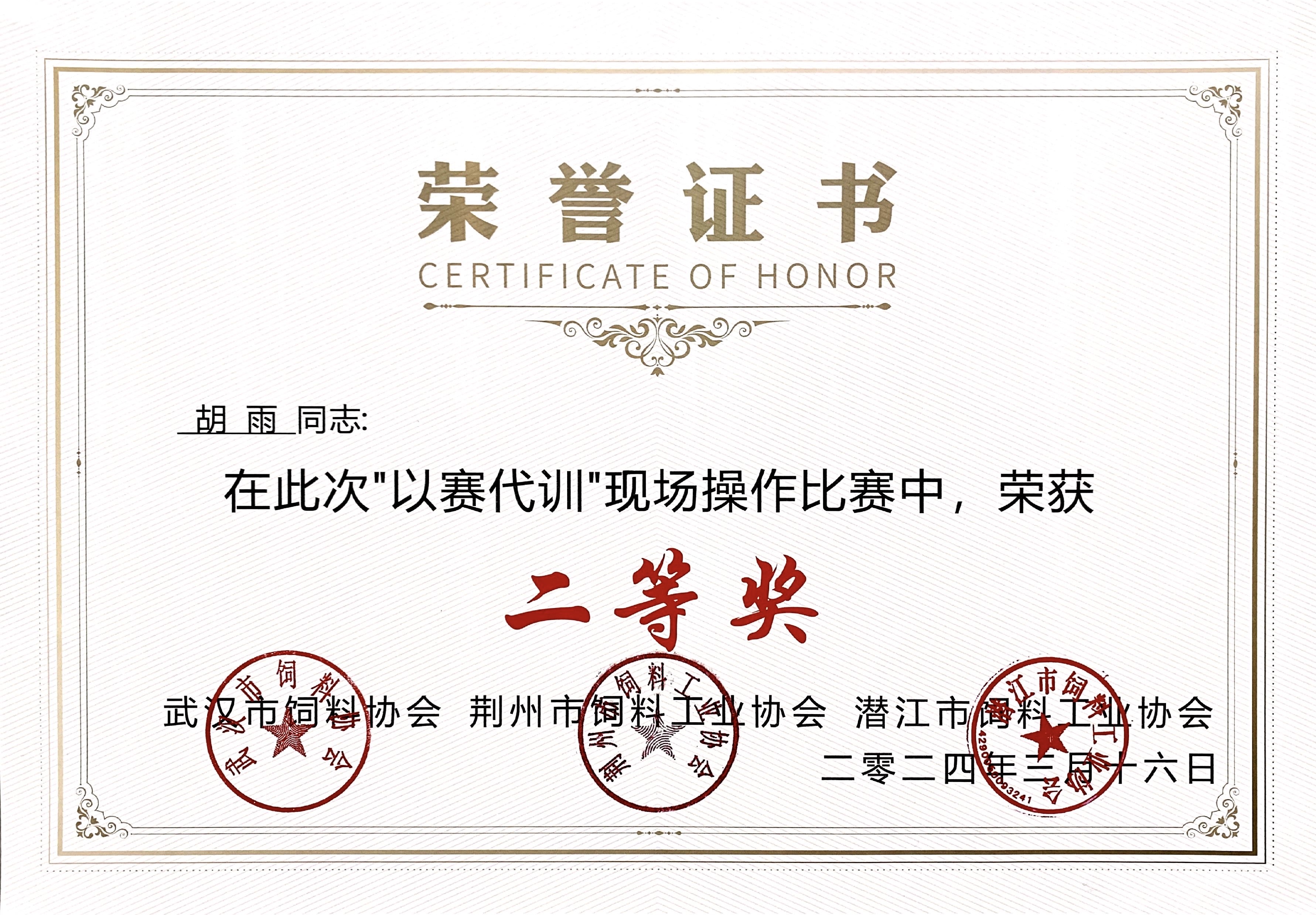 ? ? ??根據(jù)湖北省農(nóng)業(yè)農(nóng)村廳的相關(guān)精神,武漢市農(nóng)業(yè)農(nóng)村局積極組織實(shí)施,由武漢市飼料協(xié)會(huì)主辦的“以賽代訓(xùn)”專業(yè)技能考試大PK活動(dòng)圓滿落幕。在這場激烈的競爭中,我司質(zhì)量部胡雨憑借扎實(shí)的專業(yè)知識(shí)和出色的應(yīng)變能力,脫穎而出,榮獲比賽“二等獎(jiǎng)”,為公司贏得了榮譽(yù),同時(shí)也充分展現(xiàn)了個(gè)人風(fēng)采,可喜可賀!大賽由武漢市飼料協(xié)會(huì)主辦,荊州市飼料工業(yè)協(xié)會(huì)、潛江市飼料工業(yè)協(xié)會(huì)承辦。共有40多名選手在比賽中競技爭鋒。
