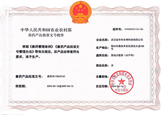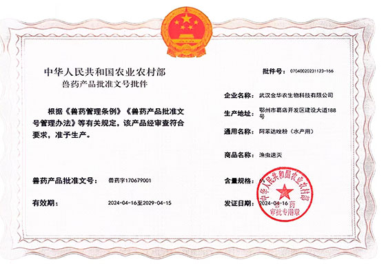 ? ? ??根據(jù)《獸藥管理?xiàng)l例》和《獸藥產(chǎn)品批準(zhǔn)文號(hào)管理辦法》的規(guī)定,經(jīng)農(nóng)業(yè)農(nóng)村部審查,準(zhǔn)予核發(fā)武漢金華農(nóng)生物科技有限公司2個(gè)新版GMP水產(chǎn)漁藥相關(guān)產(chǎn)品批準(zhǔn)文號(hào)。