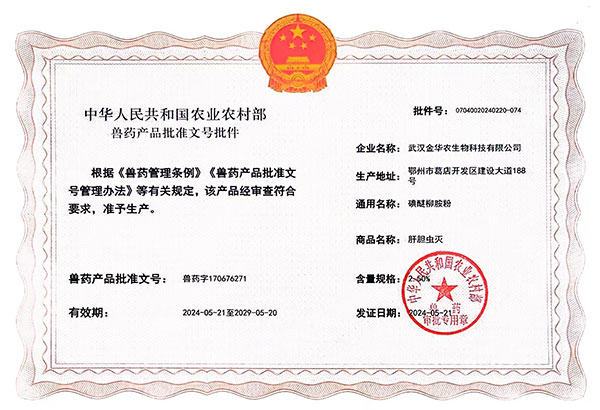 根據(jù)《獸藥管理?xiàng)l例》和《獸藥產(chǎn)品批準(zhǔn)文號(hào)管理辦法》的規(guī)定,經(jīng)農(nóng)業(yè)農(nóng)村部審查,準(zhǔn)予核發(fā)武漢金華農(nóng)生物科技有限公司4個(gè)新版GMP獸藥相關(guān)產(chǎn)品批準(zhǔn)文號(hào)。