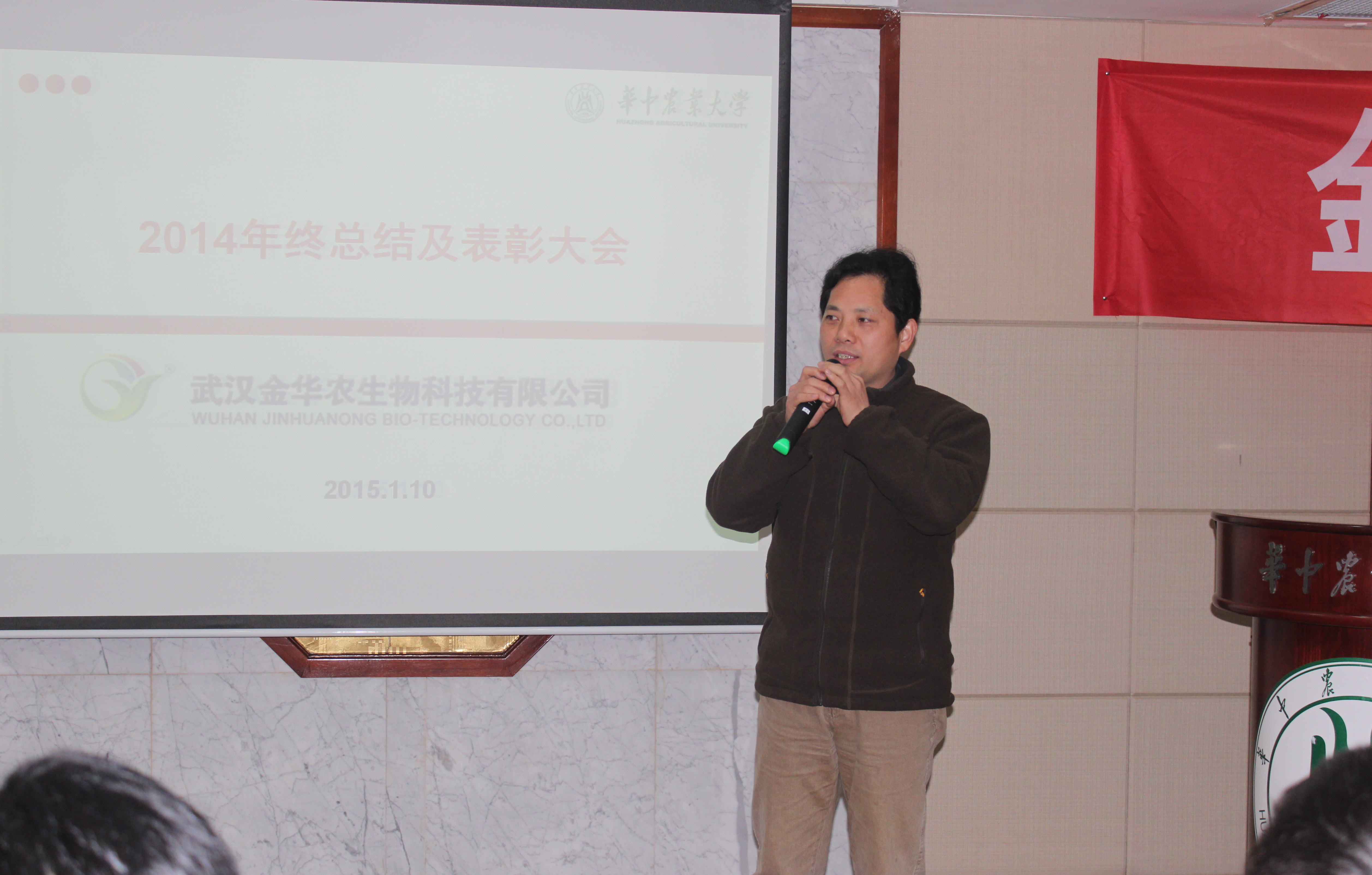 1月10日,華中農(nóng)業(yè)大學附校黨委書記李仁剛、華中農(nóng)業(yè)大學人事處處長龍健飛、華中農(nóng)業(yè)大學獸藥研發(fā)專家陳品、新聞媒體負責人一行來到校內(nèi)國際學術交流中心,出席金華農(nóng)生物2014年終工作總結及表彰大會,并向公司致賀。