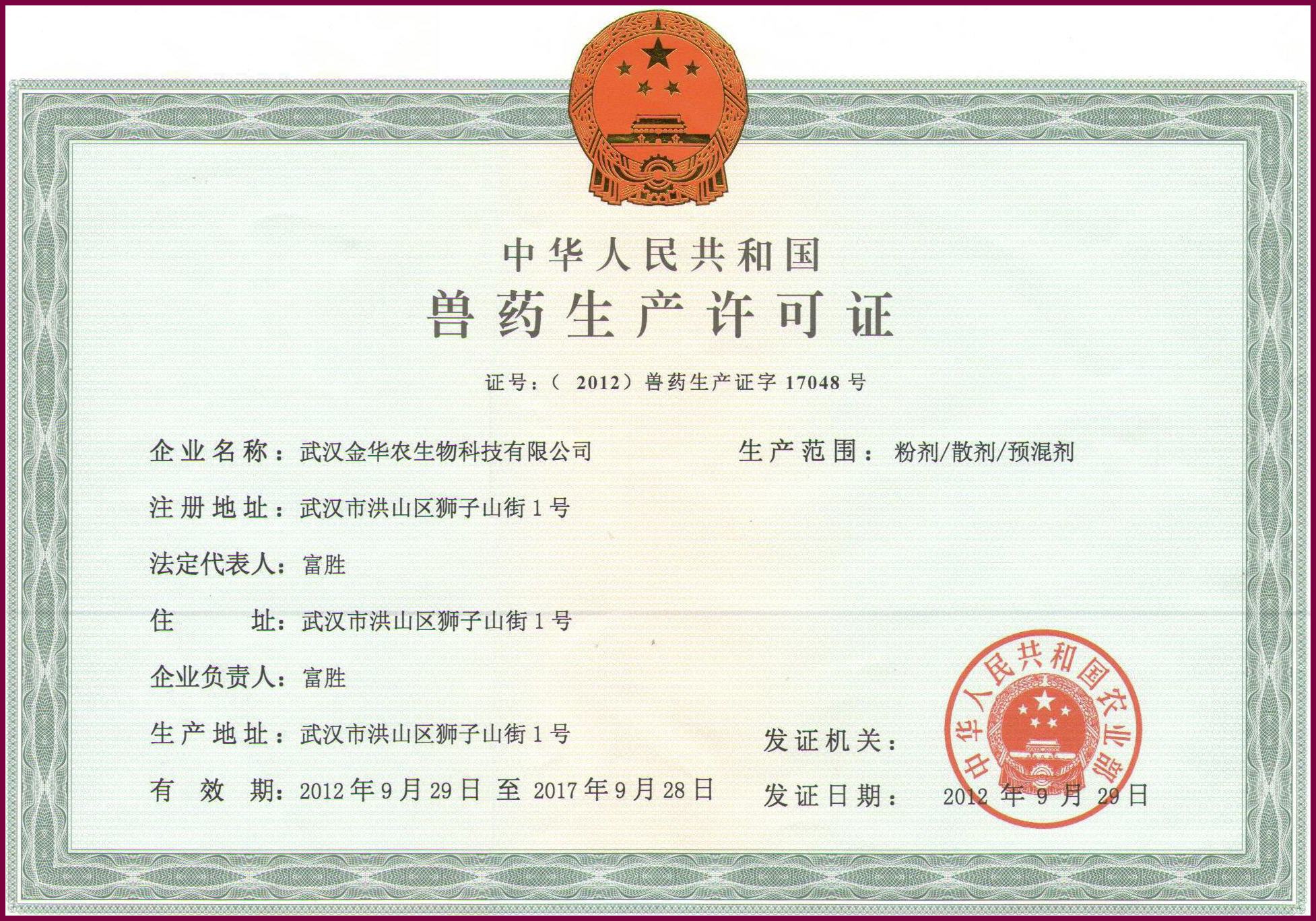 ??2012年9月28日、29日,武漢金華農(nóng)獲國(guó)家農(nóng)業(yè)部頒發(fā)雙證---【(2012)獸藥GMP證字317號(hào)】和獸藥生產(chǎn)許可證【(2012)獸藥生產(chǎn)證字17048號(hào)】同期到達(dá),雙喜生輝!