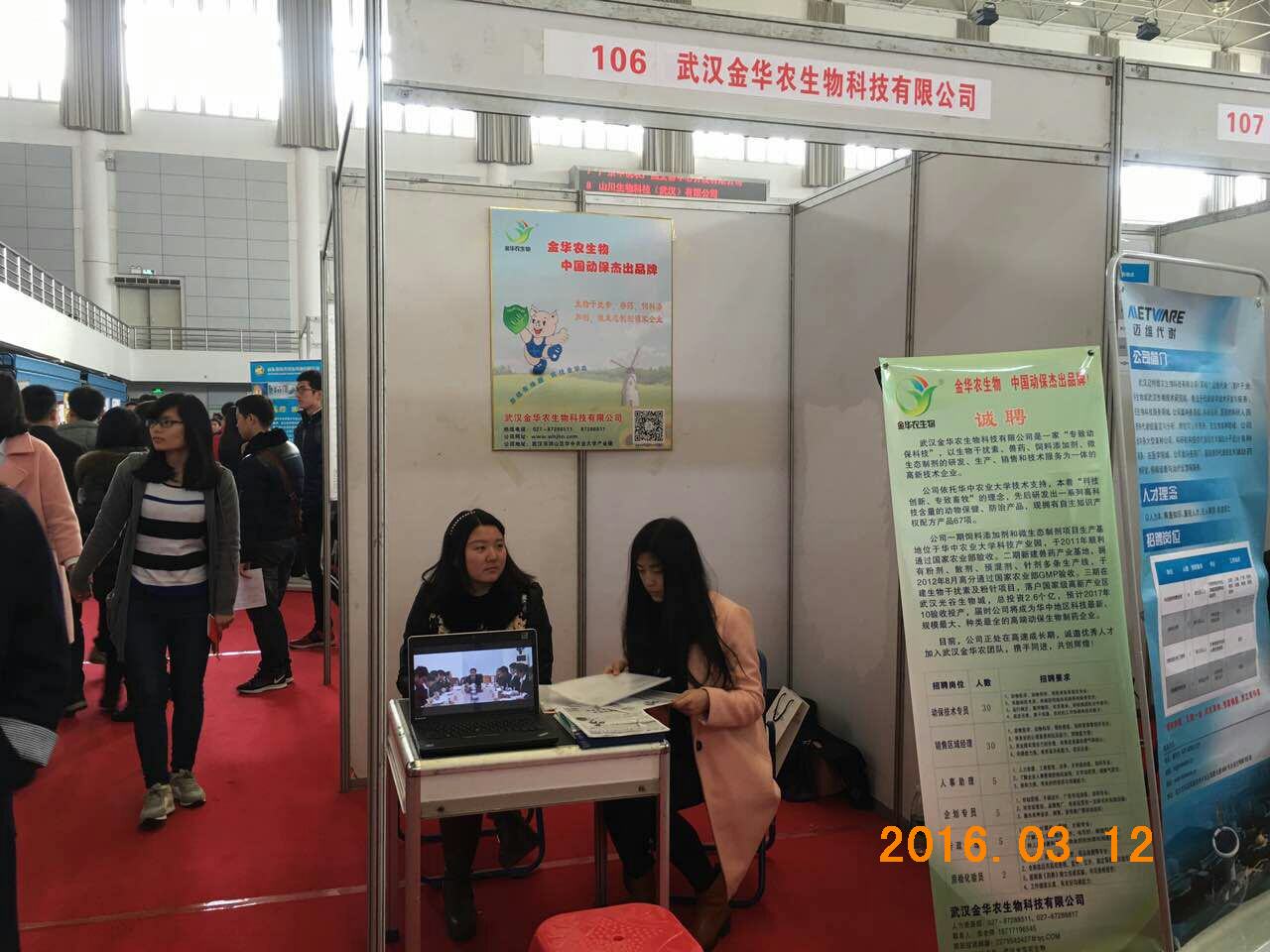 2016年3月12日,由湖北省高校畢業(yè)生就業(yè)指導(dǎo)服務(wù)中心和華中農(nóng)業(yè)大學(xué)共同舉辦的2016屆畢業(yè)生春季供需見(jiàn)面會(huì)在學(xué)校體育館舉行,5000余名高校學(xué)子參加了現(xiàn)場(chǎng)見(jiàn)面會(huì)。武漢金華農(nóng)生物應(yīng)邀參加,攜8大種類(lèi)共66個(gè)崗位高校攬才。