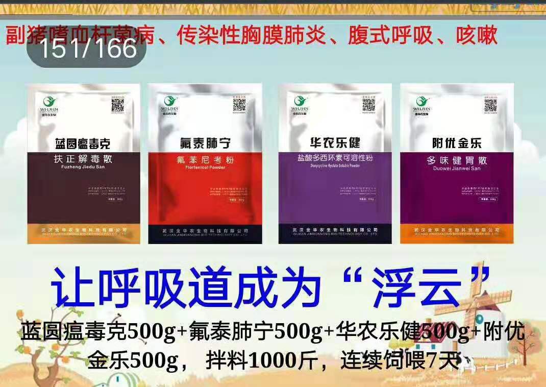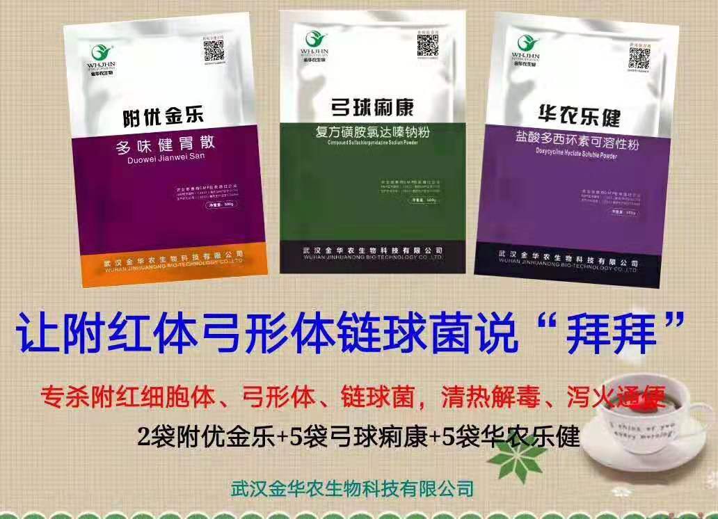 ? ?附優(yōu)金樂1kg+華農(nóng)樂健500g+弓球痢康500g+伊苯佳300g,拌料1000斤,連續(xù)飼喂7-10天,效果很好;