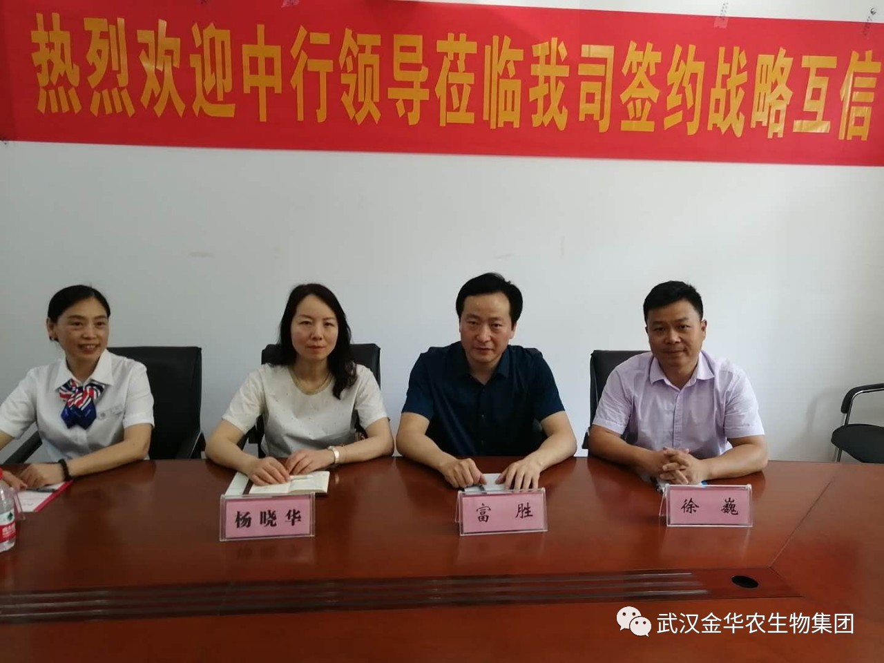 2019年6月6日上午,中國(guó)銀行武漢東湖新技術(shù)開(kāi)發(fā)區(qū)分行行長(zhǎng)楊曉華、華農(nóng)支行行長(zhǎng)余陽(yáng)一行蒞臨我司參觀考察,就深化銀企合作、共建互信互惠戰(zhàn)略合作伙伴關(guān)系開(kāi)展會(huì)談。